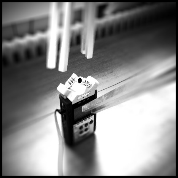 Für die Aufnahmen benutzte ich vier Mikrofone: Zwei Kontaktmikrofone (von Stan Pete gelötet) am Gehäuse der Kaffeemühle und zwei Zoom-Mikrofone im 90° Winkel an der Kurbel.
