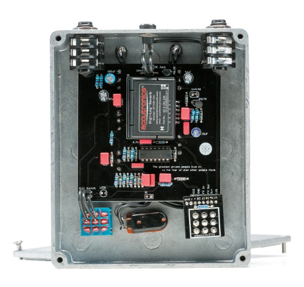Von ganz dezentem Hall, bis hin zu einem wilden Noise-Rausch, lässt sich der Effekt mit den zwei Reglern wunderbar formen. Dreht man die Verzerrung (Gain) nach und nach auf, wird der Sound nicht nur zunehmend schmutziger, auch die Hallfahne wird länger und komprimierter. Hier bedarf es – je nach gewünschtem Sound – einer Feinabstimmung der vier Regler, um den Klang des Kaleidoscopes unter Kontrolle zu halten. Neben dem Bypass-Switch finden wir zwei weitere Schalter. «Hold» lässt das Gerät in eine Art «Freeze-Modus» schicken und in sich selbst oszillieren. Wie heftig dieser Effekt ausfallen soll, lässt sich mittels des Swell-Amount-Reglers gut kontrollieren. Der dritte Fußschalter mit der Bezeichnung «Kill», schaltet das trockene Signal ab und lässt nur noch das Effektsignal erklingen. Vor allem für experimentelle Swell-Sounds ist das eine tolle Sache. Mit dem Hold-Taster lässt sich natürlich allerhand Schabernack treiben. Je nachdem wie der Swell-Regler eingestellt ist, brechen beeindruckende Krachwellen über einen herein.